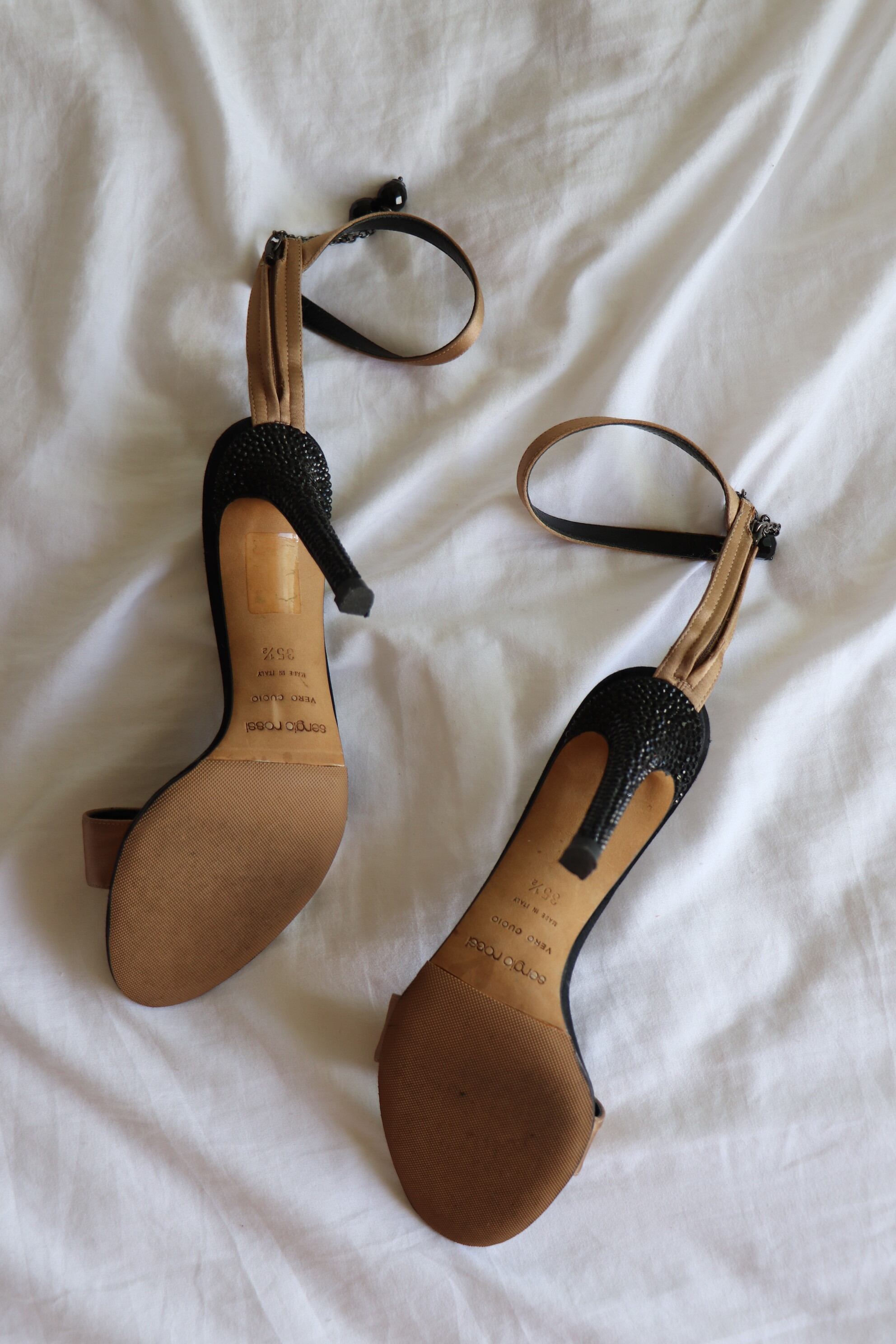 光沢のあるシャンパンゴールドのサテン素材とヒール部分のブラックストーンがセクシーでモードな一足